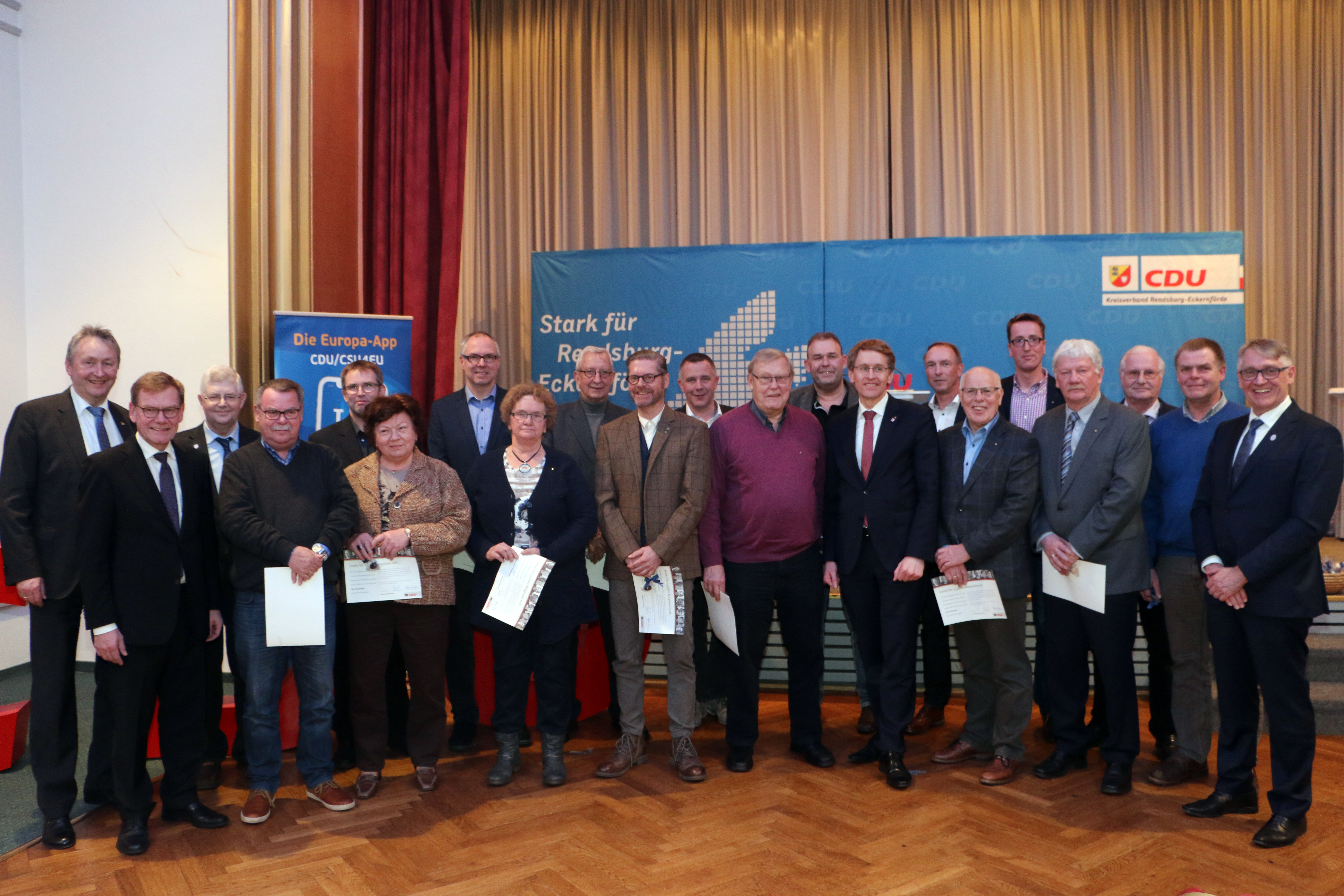 Am Freitag, den 08. März 2019 fand im ConventGarten in Rendsburg die nachgeholte, traditionelle Mitgliederehrung statt, die im Dezember dem Kreisparteitag weichen musste. Geehrt wurden Mitglieder für 25, 40 oder 50 Jahre Parteizugehörigkeit. Unter den 25jährigen war auch ein ganz besonderer Geehrter: Ministerpräsident Daniel Günther. Dennoch ließ er es sich nicht nehmen, nach seiner eigenen Ehrung anschließend zusammen mit unserem Kreisvorsitzenden und Bundestagsabgeordneten Dr. Johann Wadephul und seinen beiden Landtagskollegen Hauke Göttsch und Hans Hinrich Neve die Ehrungen der weiteren Mitglieder vorzunehmen. Der Ehrengast des Abends war der Spitzenkandidat der CDU Schleswig-Holstein zur Europawahl, Niclas Herbst. In einer leidenschaftlichen Rede hob Herbst die Wichtigkeit der anstehenden Wahl hervor und forderte die Zuhörer auf, sich für Europa zu engagieren und an der Wahl teilzunehmen.