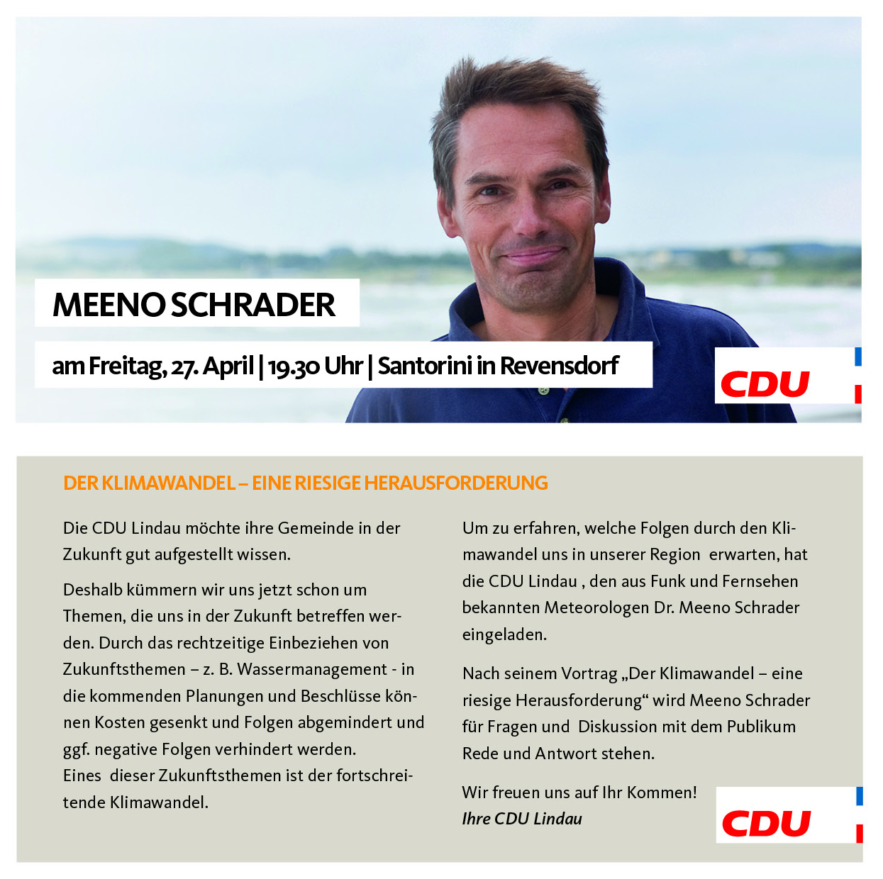 Eines dieser Zukunftsthemen ist der fortschreitende Klimawandel. Um zu erfahren, welche Folgen durch den Klimawandel uns in unserer Region erwarten, hat die CDU Lindau , den aus Funk und Fernsehen bekannten Meteorologen Dr. Meeno Schrader eingeladen.